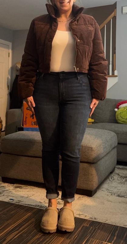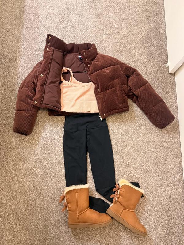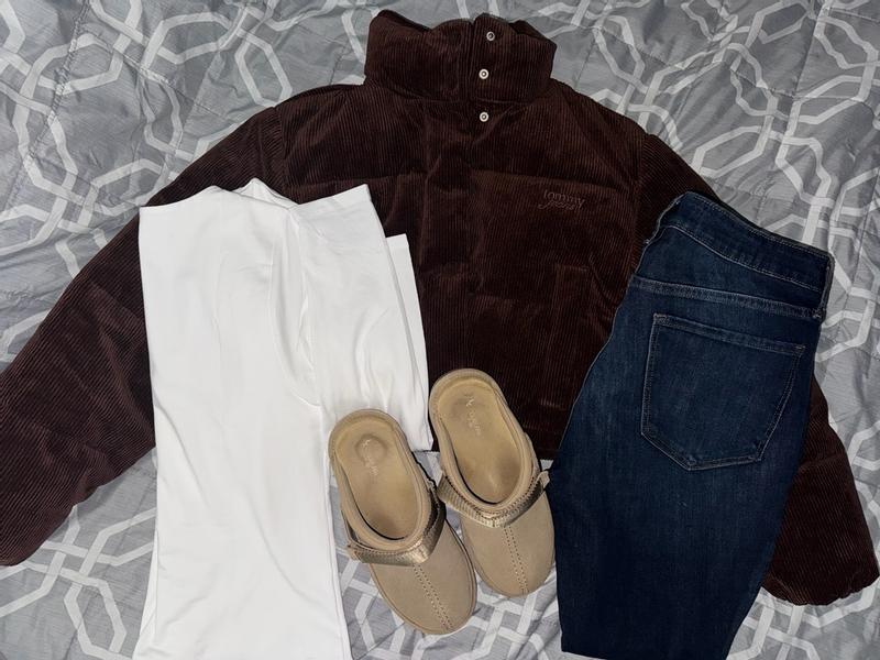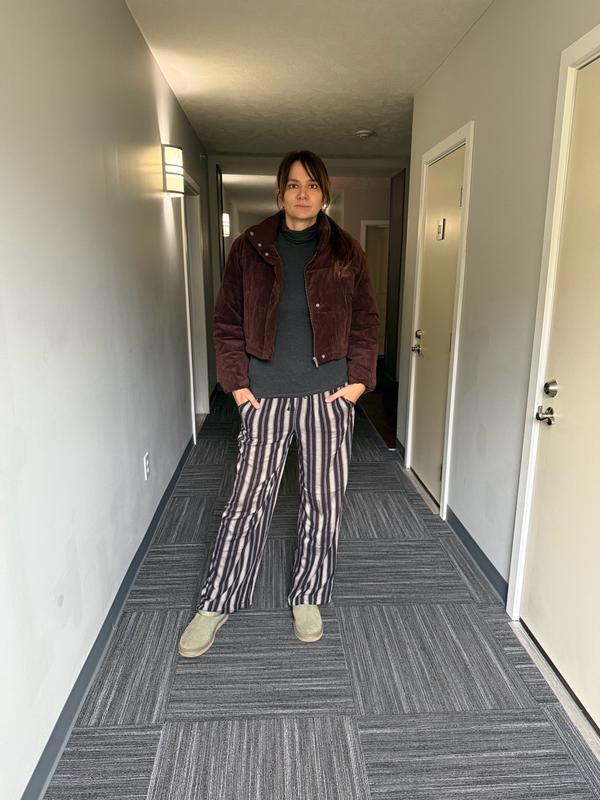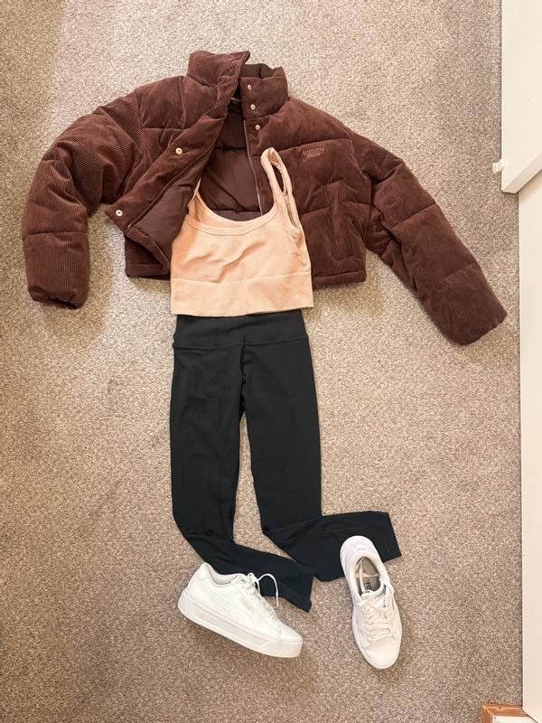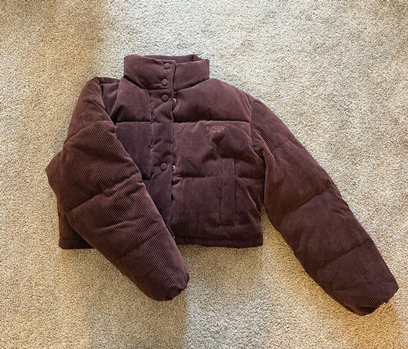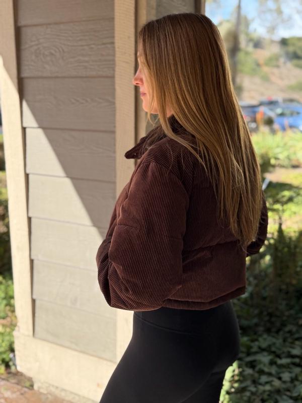 I’m wearing a size small and the fit is cropped in a flattering way without feeling too short. The corduroy texture adds a nice look and makes it feel more elevated than a basic puffer. The brown color is a deep, true brown and it is not too red or washed out, which I really like because it pairs easily with black, denim, and neutrals. It is warm but not heavy, so I can move comfortably and layer without feeling bulky. The pockets snap closed to keep things secure, although they are not very deep. For everyday wear, it has been easy to throw on and style with leggings or jeans. Overall, I really like this jacket and how simple and wearable it is.