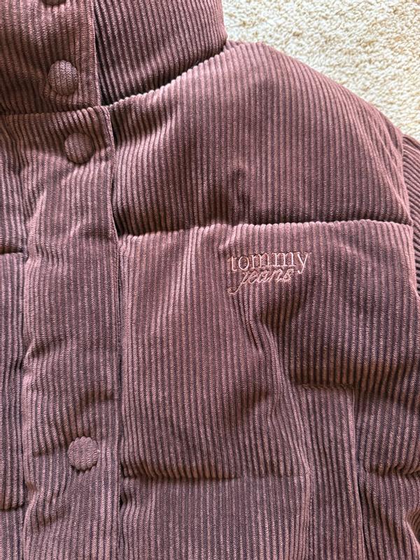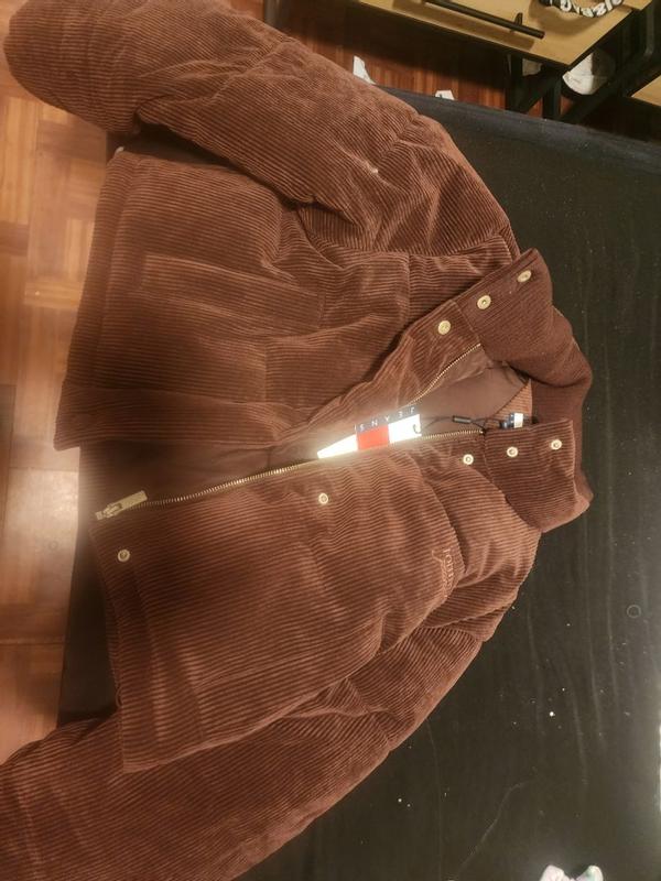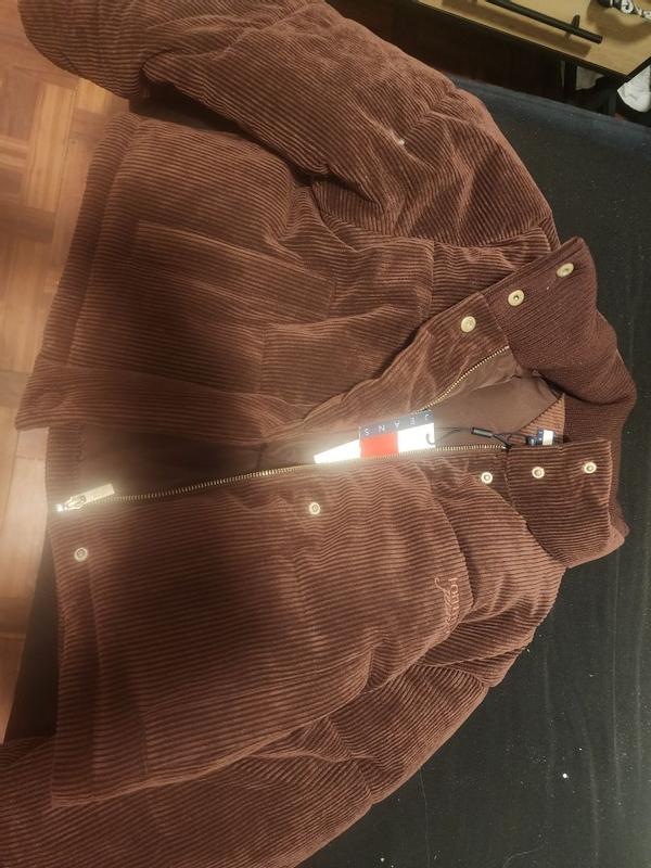 Tommy Hilfiger corduroy brown puffy jacket. It has a full zipper and buttons two side pockets fits perfectly on the waist. I wear a size small and it fits me perfectly. The puffer is extra warm and comfortable. The material is great and durable . Definitely a wow fall/ winter piece add to my wardrobe this season. The color brown looks like a deep dark velvet chocolate it’s beautiful.