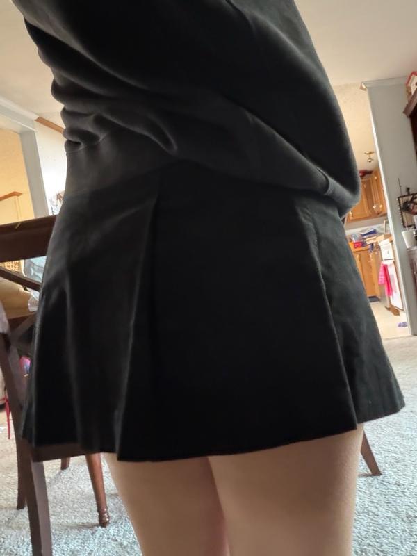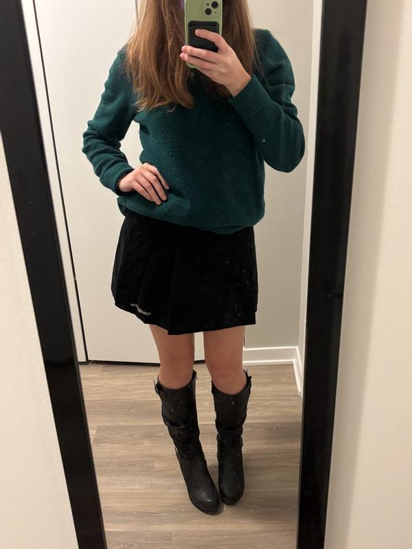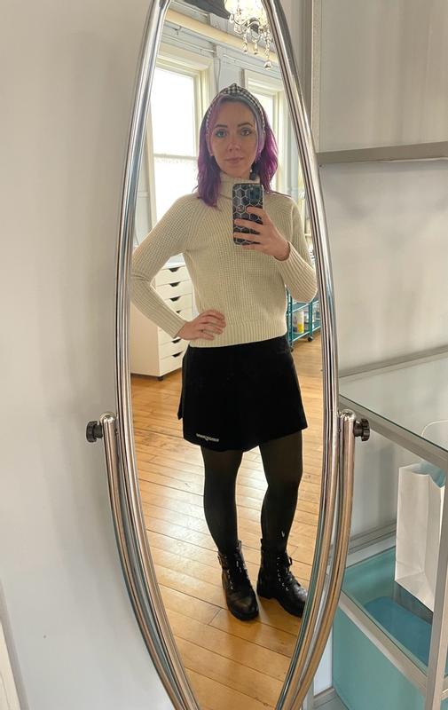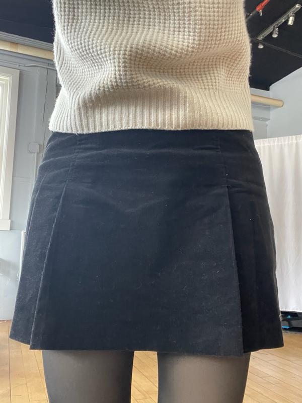 This is a cute skirt and a good addition to my wardrobe. I’m 5’1 and 112lbs and typically wear XS-S so this skirt fits just a bit too big in the waist but it’s easily hidden with layering thick tights underneath and a well placed sweater. It’s a corduroy material which is nice but also picks up every piece of fuzz or hair so a lint roller near by is recommended. Since it’s a simple black skirt it can be paired pretty well with most things and dressed up or kept casual. The only thing I’m not too keen on is the large logo on the side I feel like it takes away from the look of the skirt. Other than that it’s a great piece!