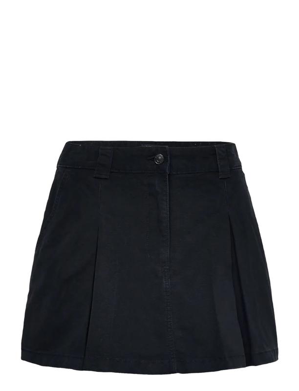 This short black skirt is true to sizing. The material is soft and 100% cotton. It is a little stiff so any sort of movement sort of changes the shape of the skirt and maintains it. There is little swaying of the material whenever you walk. The skirt itself is pretty short especially for people with wide hips. it very conveniently has pockets that are wide enough for your phone. I wish it had shorts under. Anything else I can say about the skirt. It’s cute! I would recommend.