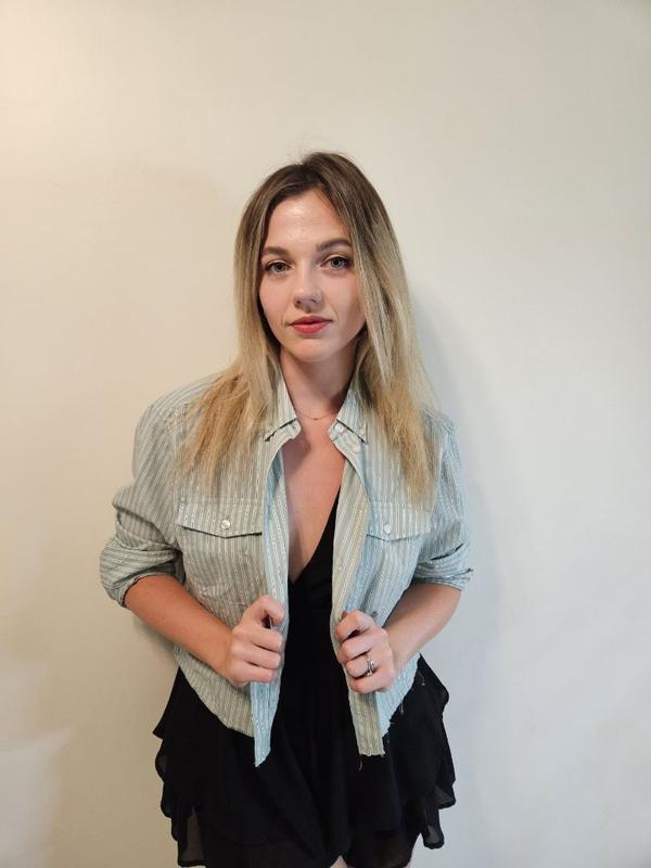 This crop shirt is perfect to put on a cooler summer day. The material is super breezy. It wrinkles easily, so make sure to hang it in the closet right away. For some reason, I expected material to be a little bit thicker. Sizewise, it's true to its size.