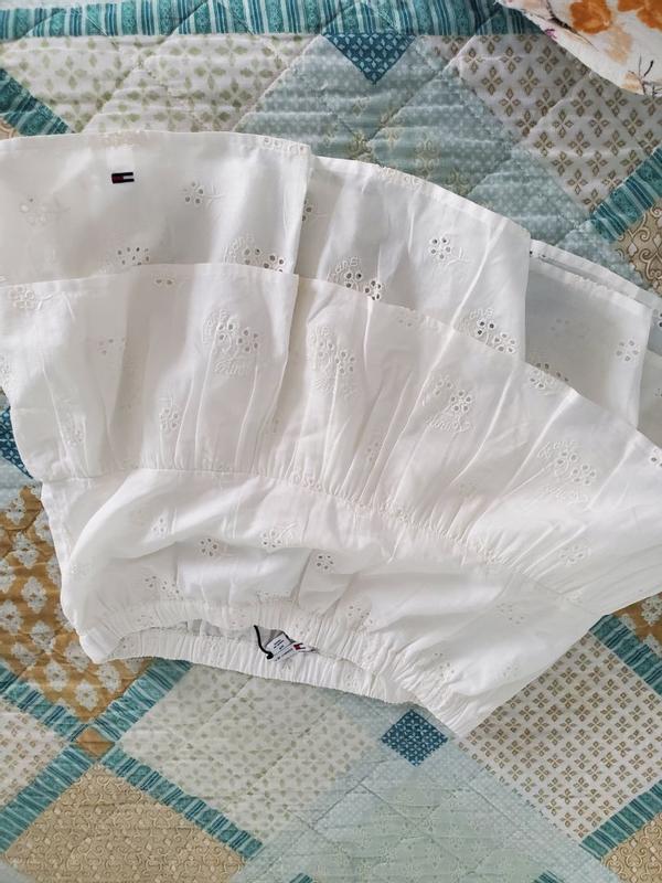 Very cute and well made. Definitely suited for someone younger (in my opinion) because of the ruffles and eyelets. Tiny stitches Tommy flag in corner and “Tommy” word stitched into design (would personally prefer that wasn’t there.). 5’4”, 140 lbs and the small was too small to be comfortable or flattering for me but would be adorable on someone younger and smaller.