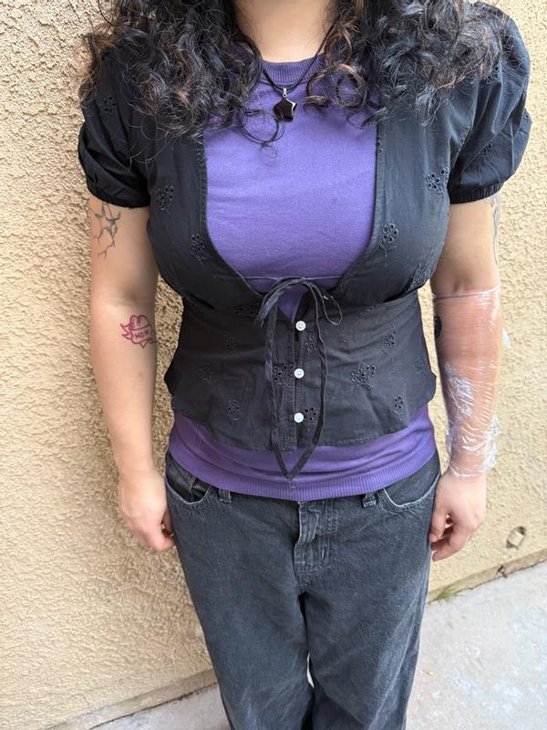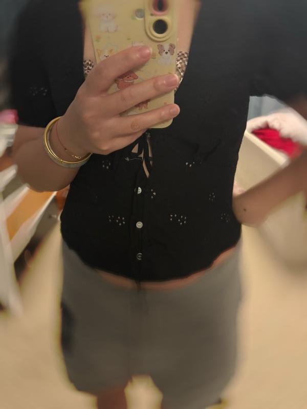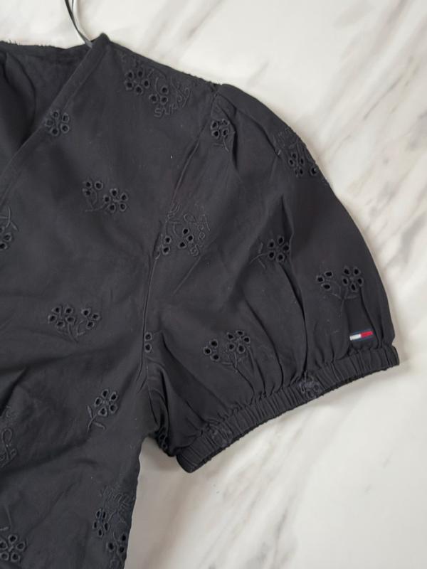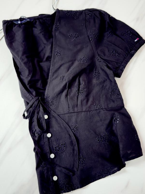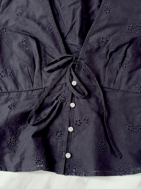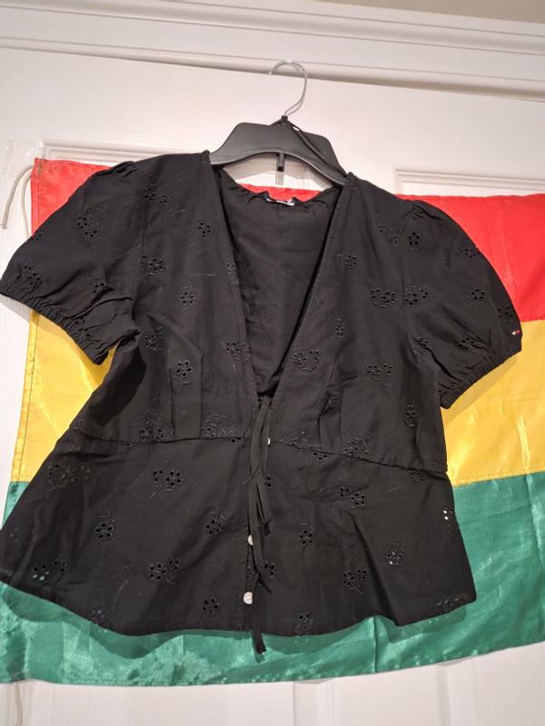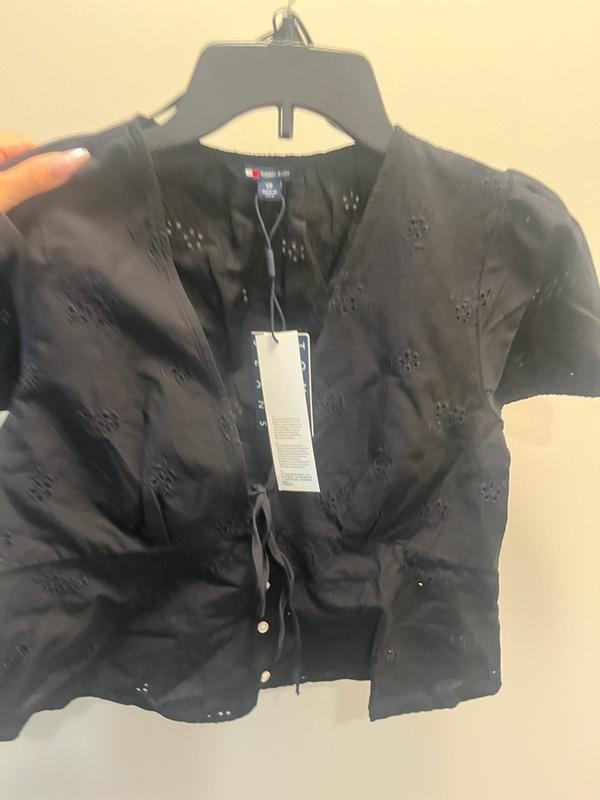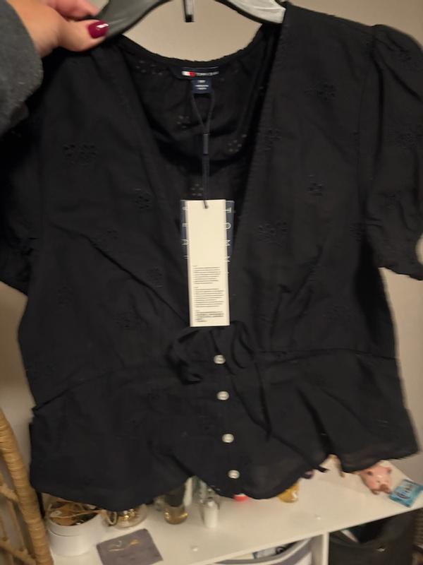 The quality on this top is great! It’s soft, lightweight cotton with pretty embroidery that feels well made. It arrived neatly packaged with a hanger and protective plastic. Fit is true to size and consistent with other Tommy Jeans pieces I’ve tried before. The tie front is such a nice touch and very on trend and it’s super comfortable to wear all day! The fabric is breezy, not stiff at all.