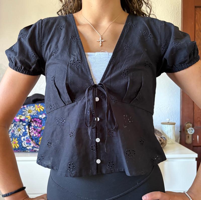 Super cute shirt, but the sleeves are a little tight. The plunge can be a little deep depending on what you’re comfortable with but could dress it up or down depending on how you wear it
