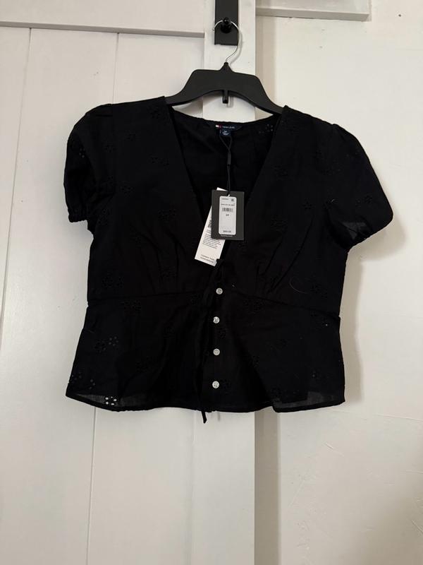 This is a cute shirt that would go well with a nice bralette. The V shape is deep. Tommy Hilfiger is not a cheap brand, however I found the first button is already missing when I opened it.