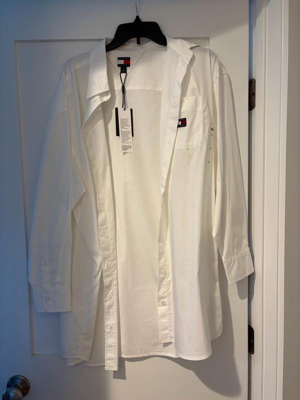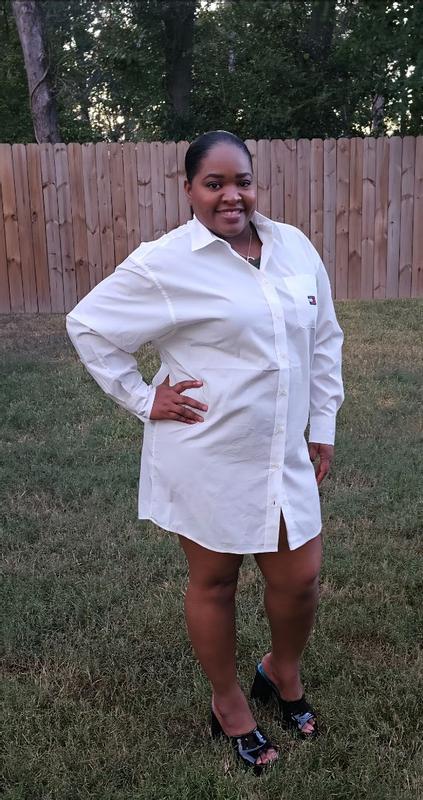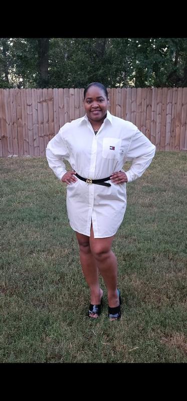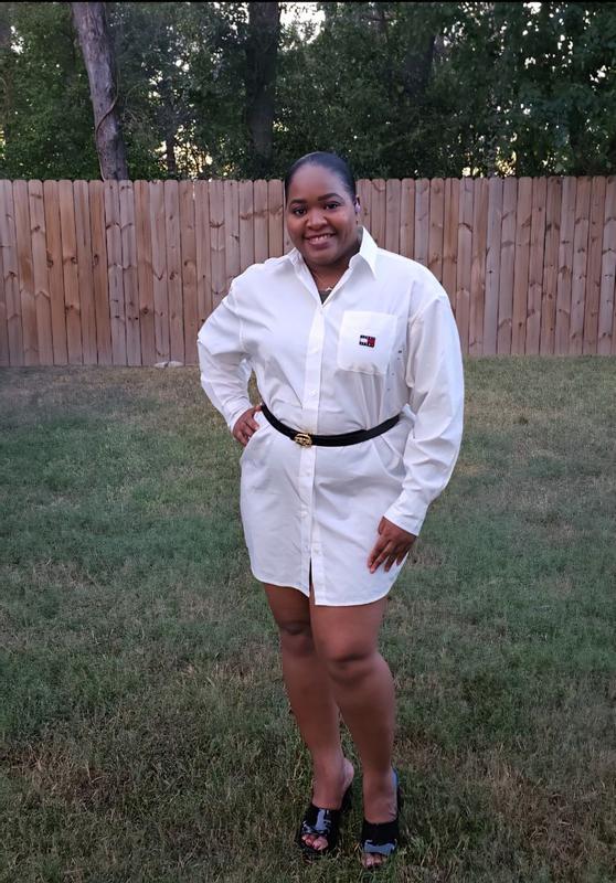 Tommy Hilfiger oversized mini shirt dress is perfect for fall weather! It looks great dressed up with a pair of high heals or casual with a sun hat and boots. The dress is not tight but slightly roomy and also looks great with a shirt layered underneath or a sweater on top. I love the quality and crisp feel of the fabric. Perfect for any occasion!