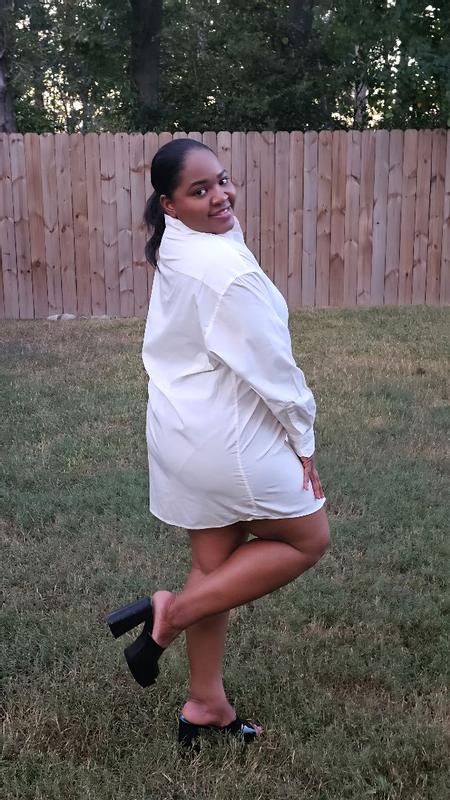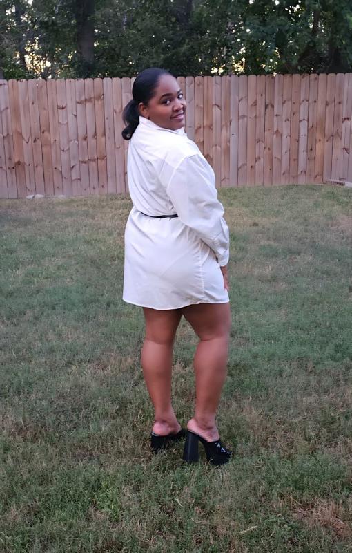 This shirt dress is fabulous! Very chic and sexy. It can be dressed up or worn casually. I added a belt and some heels to add some pizzazz. You can also pair it with some tights for a more casual look. Or wear it by itself. It is large and long enough to be worn as a dress. Quality is superb.