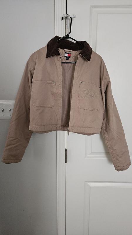I found this jacket to be really comfortable. The inside was soft. There are shoulder gussets so that you have room to move around freely, but they do look a little bit bulky. I like that you're able to buckle the waist to cinch it for a more fitted look. The corduroy neck is a nice detail. I don't love the Tommy Jean's logo on the front pocket, but otherwise, this is a cute, neutral, midweight jacket.