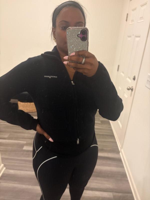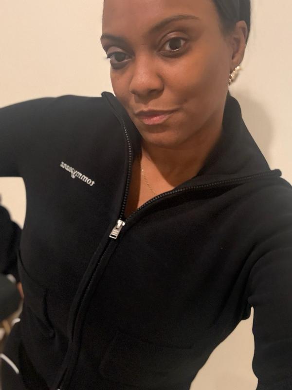 Love this sweatshirt! It is SO surprisingly soft and comfortable. It’s thick and warm but not overbearing. It’s a deep black color with a small logo. It has no packaging smell and the shape fits well. I only wish it was longer as it is definitely crop topped but still so cute!