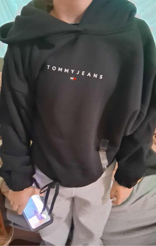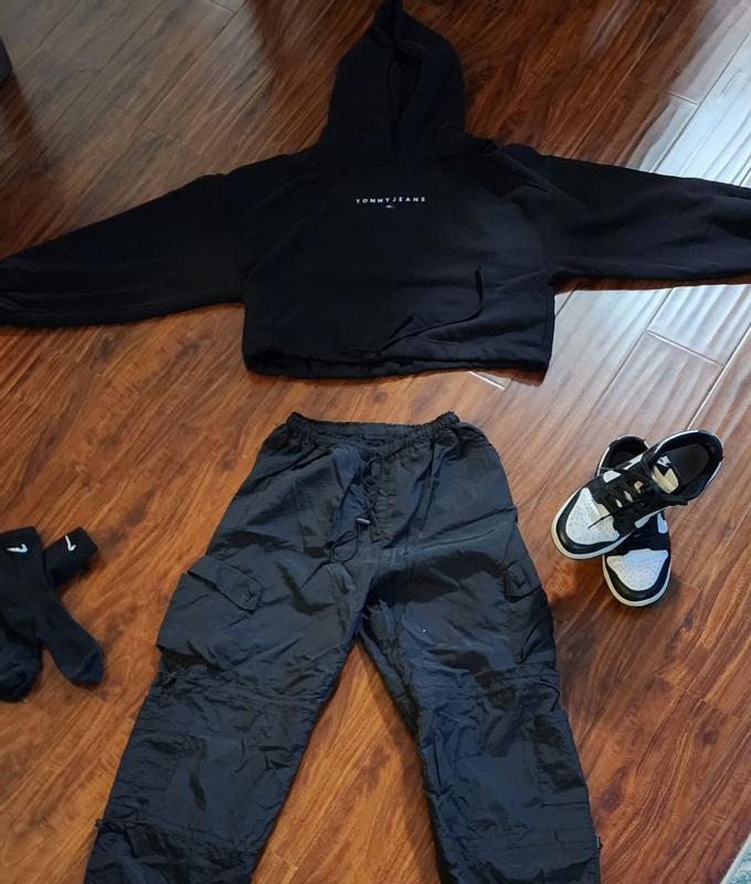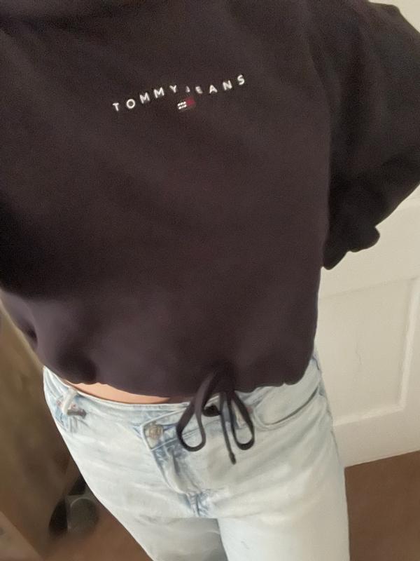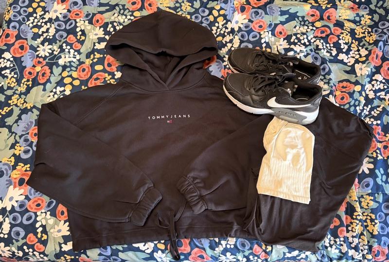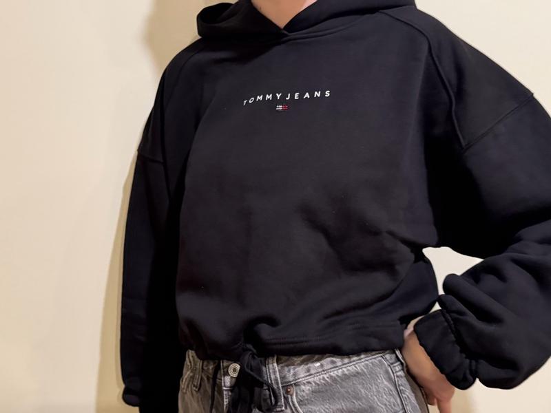 Very cute, casual and trendy cropped hoodie. Has a Tommy jeans bling logo in the front and a drawstring waist to cinch it in if you like it to be more fitted. I like that I can have the option to wear it relaxed or more fitted. Great quality material made from cotton. And machine washable.