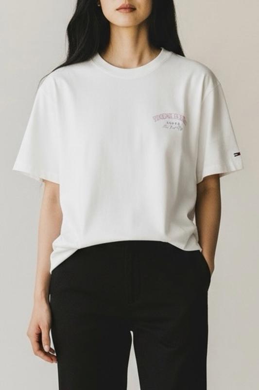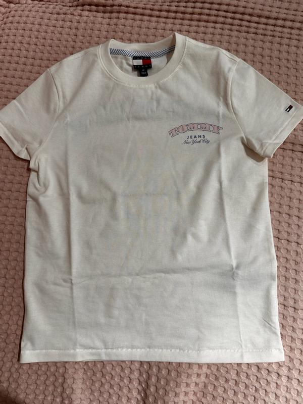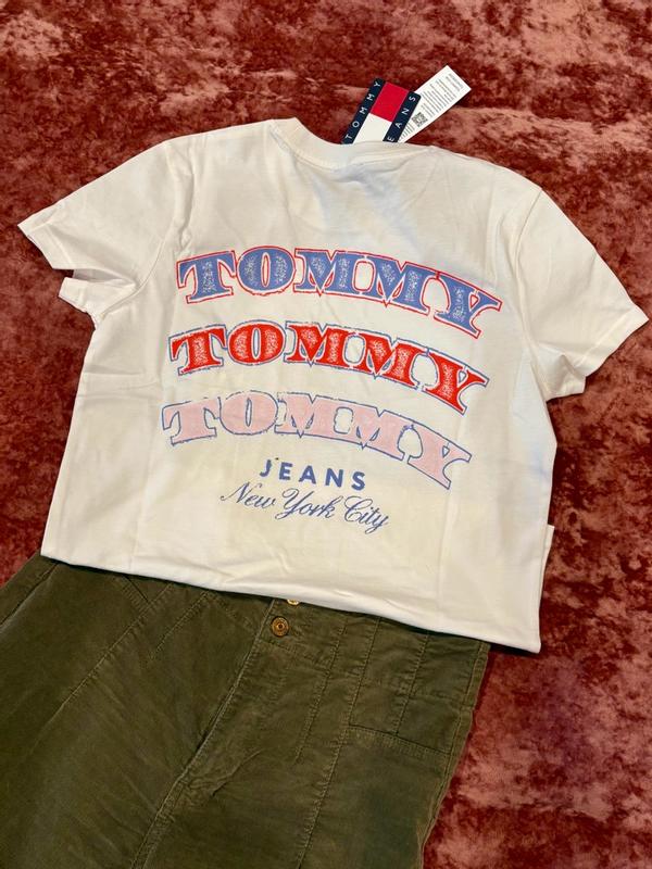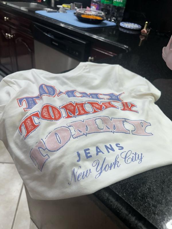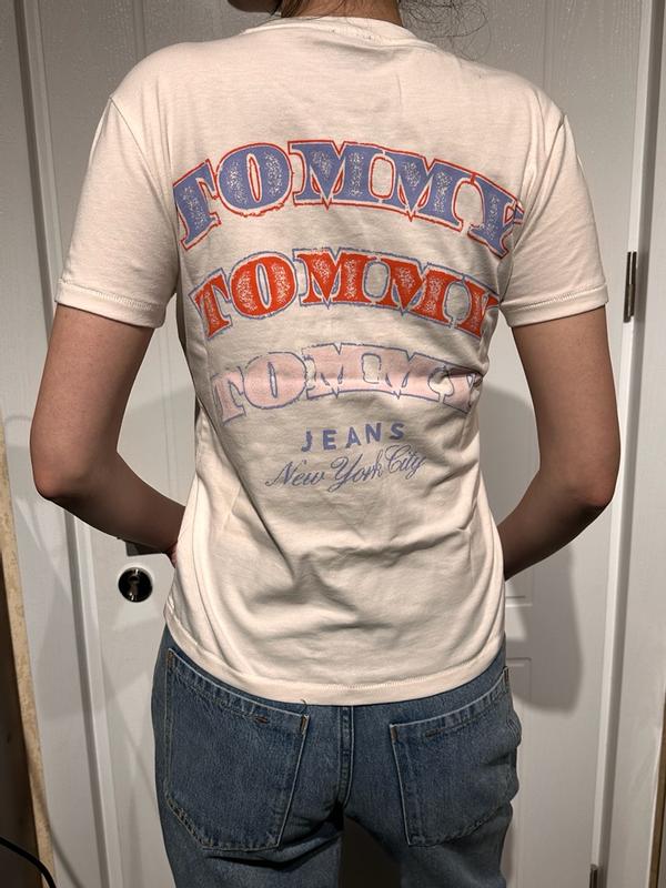 This Tommy Jeans graphic T-shirt is a great mix of classic style and everyday comfort. The design stands out with its vintage-inspired logo print on the back, giving it a cool, retro New York vibe while still feeling modern. The front logo is subtle and clean, making the shirt easy to style without being too loud. The fabric feels soft and breathable, perfect for all-day wear. It has a comfortable weight—not too thin or flimsy—and feels like good quality cotton. The stitching and overall construction feel solid, and the shirt holds its shape well after wearing. The fit is true to size with a relaxed but flattering silhouette. It’s easy to dress up with jeans or layer under a jacket, or keep casual with shorts or sneakers. This is the kind of staple T-shirt you can reach for often and still feel put together.