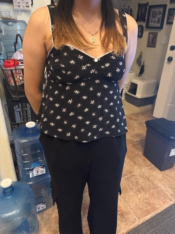 Cute and girly sleeveless blouse. Perfect for multiple seasons and can be styled dressed up or down. Material of shirt is good quality and durably made. Fits true to size and comfortable.