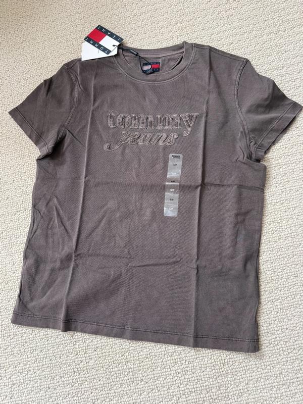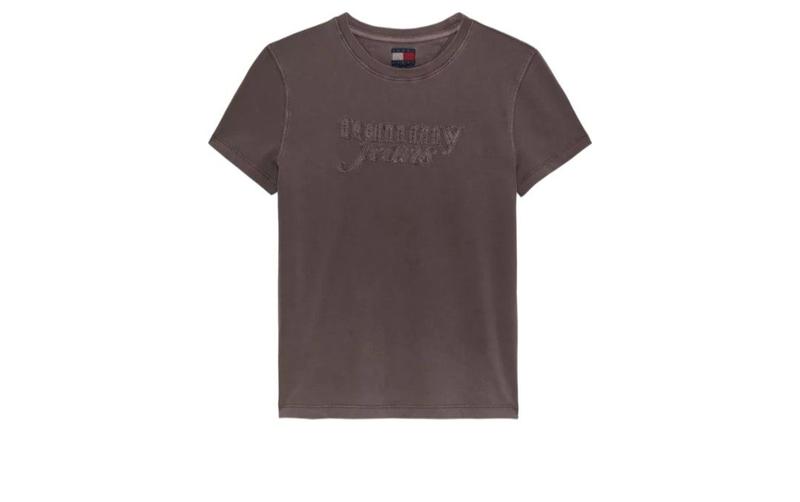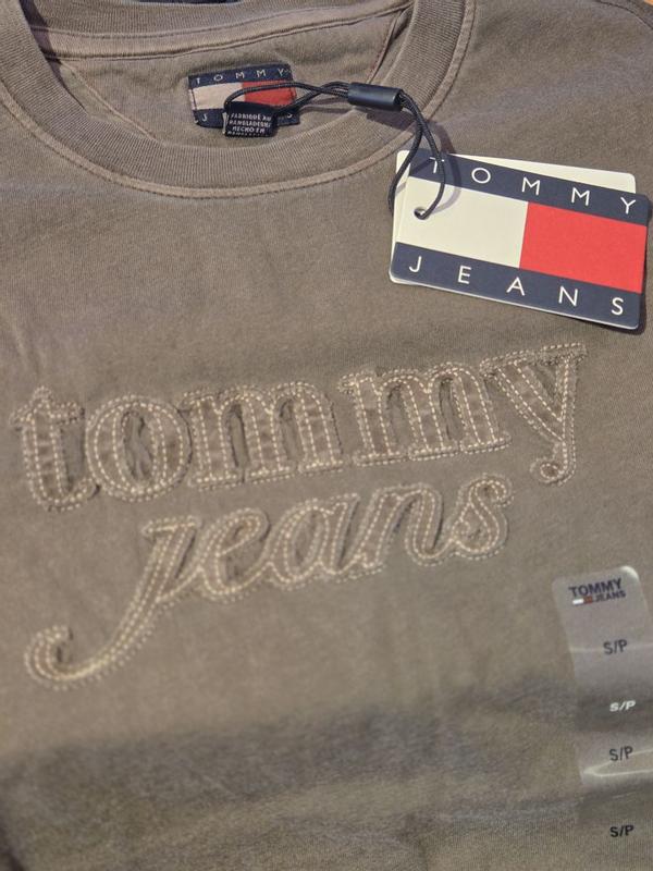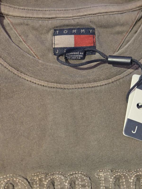 Nice basic shirt. Says Tommy jeans in a type that reminds me of cowboy lasses. Good stitching and craftsmanship. Soft but thick and durable fabric. Comfortable and visually appealing. Clean lines. Nice brown neutral color. Well made. Overall a good basic t.