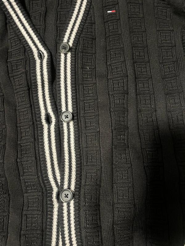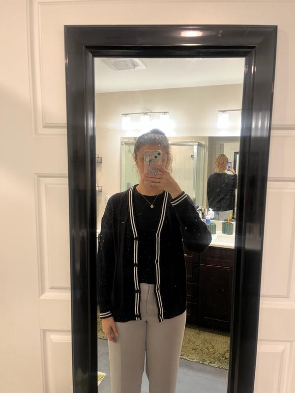 I think this is a really well made product. I typically wear a medium but I would say it runs oversized bc the small fit me just fine and was long enough in the arms. I’m 5’8 for reference. I love the pattered detail and the white stripes that make it just a bit different than your standard cardigan. I have not washed it yet so can’t speak on that