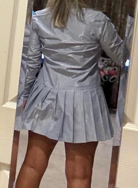 I thought this dress looked really cute and the pinstriping makes it dressy. However, the length of the dress is entirely too short and I’d be worried my butt would be sticking out all night. I am 5’5” and if it’s this short on me then it is probably only appropriate for people under 5’2” the stripes are silver and shiny which is cute but also makes it more “teen appropriate”. The skirt also drapes strangely on me but maybe it’s because I have a big butt? Not sure. This is perfect for a skinny teenager.