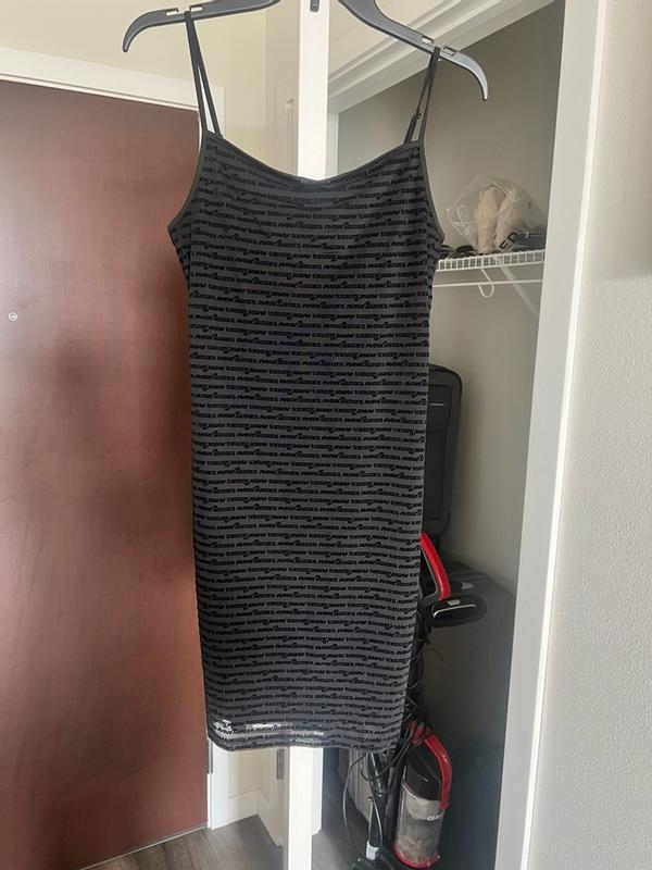 Aah!! It’s so cute! I surprised my teenage daughter with this dress and it’s so adorable! She loves it. It’s very form fitting and we’ll need to find appropriate undergarments to wear under it for no lines to show. But she’s excited to wear it to a semi formal event we’re going to later on. The Tommy logo is in tiny letters all over the dress with a sort of velvety texture to it on a mess overlay with attached lining. The straps are adjustable as well. Size up if you don’t want it hugging your body.