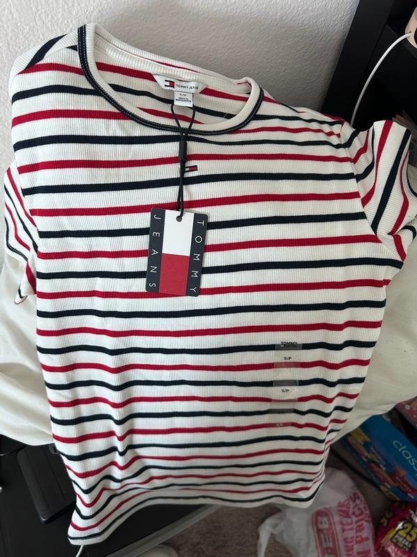 This Tommy Hilfiger ribbed tee totally exceeded my expectations. I got a size Small in the red and navy stripe, and it fits like a dream. It's nicely slim without being restrictive. The ribbed fabric hugs in the right places and smooths things out without feeling tight. It’s super flattering, especially when tucked into high-waisted jeans or trousers. The material is soft with a nice stretch, and it's breathable enough for long days at work or walking around the city. I can wear it all day without itching or needing to adjust it. The sizing is true to size. I’m wearing a Small, and it fits snug in a comfortable, fitted way. If you prefer a looser or more relaxed look, you might want to size up. I’ve washed it a couple of times already and it has held up well. There’s been no fading, shrinking, or loss of shape so far. The stitching feels solid, and the ribbed texture still looks crisp. Style-wise, it’s classic and timeless. The horizontal stripes and tiny Tommy logo on the chest give it a vintage, sporty vibe without being too loud. It’s really easy to dress up with a nice skirt or down with jeans and sneakers, so it’s a very versatile piece. Overall, I love this top. It’s a staple that works in any season and can be styled so many different ways. I would definitely buy it again in more colors.