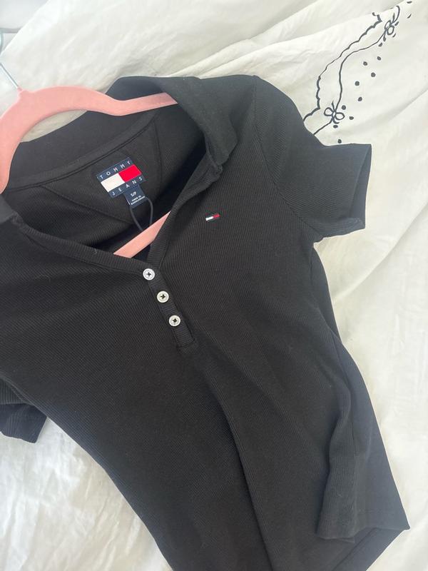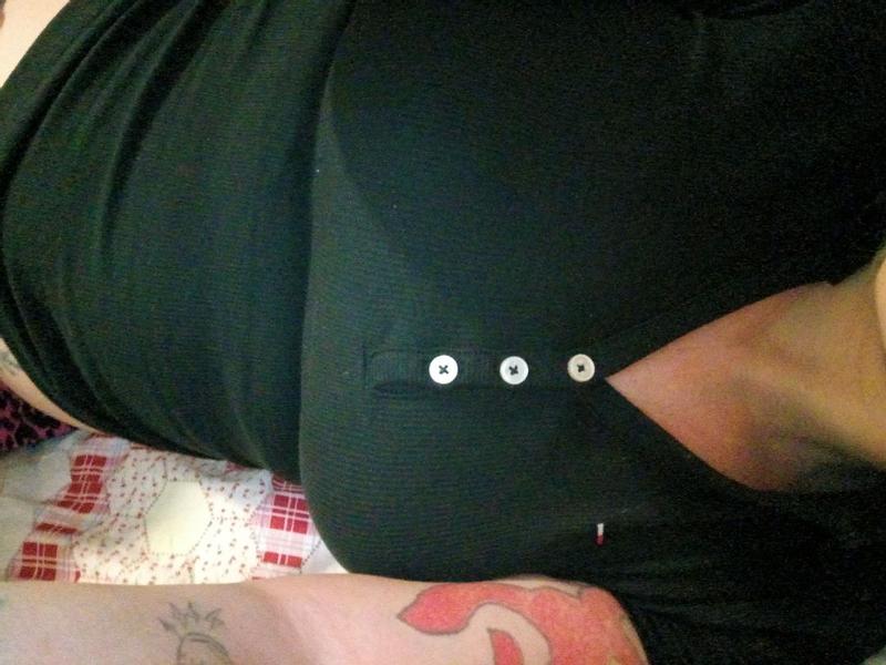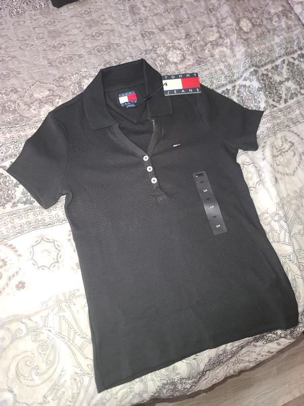 This polo shirt has a very flattering fit. The décolleté is sexy without being indecent. It is easy to match as it is black. It sizes small though. I can wear S or M depending on the brand. Although a S size, this fits more like a XS. Buttons were distended across my chest. Length was fine and it fit my waist well.