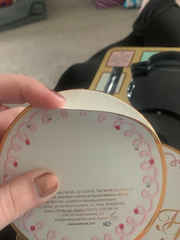 CHEAP! Packaging very cheap. Made of gold card board that arrived scuffed and damaged. Does not open like a compact, rather the top pivots to one side...very awkward. Blush colors are very bright. If you like more subtle colors these might not work for you. The overall look is very juvenile. The eye colors are nice and give you many options to mix and match. The little squares with snow flakes on the right side of the package are just decoration. I had hoped it was product, but no such luck. Overall, while I am a huge fan of the Too Faced brand, this product really missed the mark. The overall cheap and awkward packaging, juvenile look as well as the almost cartoon colored blush make this item a return for me. So sad.