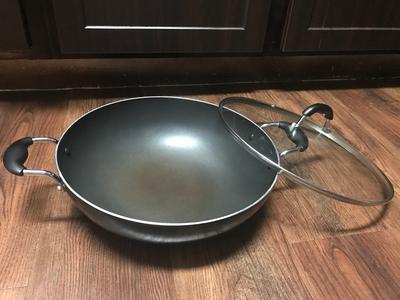 I love this pan! The wok is bigger than I expected but worked out perfectly! The packaging it arrived it wasn’t the best but I kept it and love how it is non stick and super easy to wash. If you’re thinking about it... don’t! Go ahead and buy it. Got it on sale for a great price! Not heavy at all!