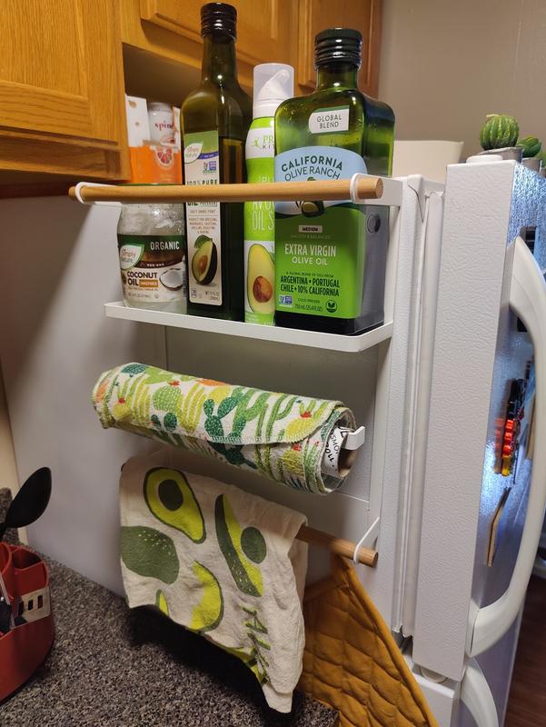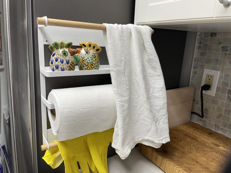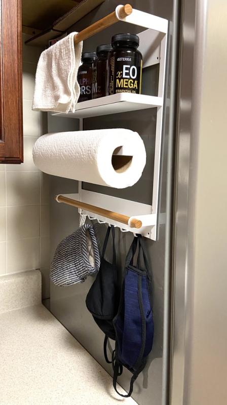 Needed additional organization for knick knacks cluttering counterspace. Am able to roll up hand towels on the top shelf, hang used towels on the wooden dowel, hang a regular sized paper towel roll, hang keys and pot holders on the bottom row of hooks. Very strong magnet backing - not concerned about it falling off. Clean modern aesthetic - happy with purchase!