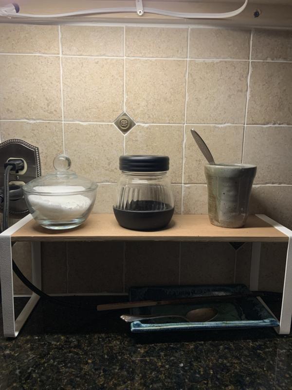 I use it to make extra room on my limited counter space and it’s perfect. It’s beautiful and fits right into our decor. It’s sturdy but minimal. I love it.