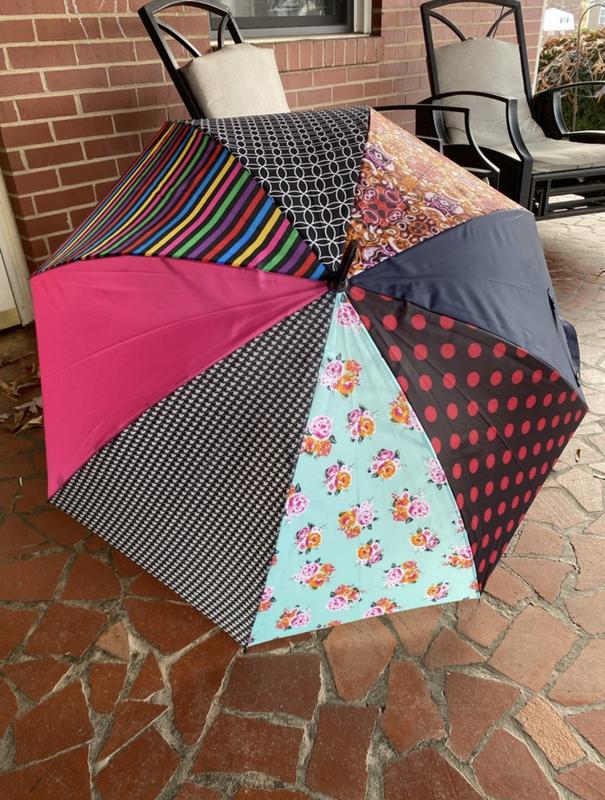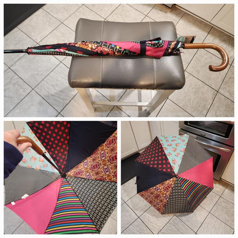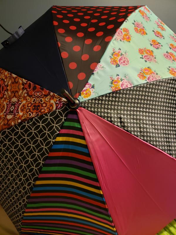 • Unique fashion stick umbrella using excess fabrics to create unique, one of a kind canopy gore combinations