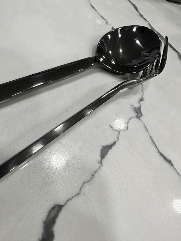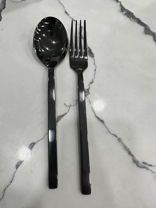 I love how dark these are, they are almost like a gunmetal color, still have a shiny coat to them like a silver would, but they go perfectly with our dark plates. The large spoon is very large, possibly too big, but I love that I have a soup spoon option. They are a great weight and they feel very nice in your hand when eating. We will def be buying a full set for when we have guests. I do wish it had two sizes of forks (salad and dinner) but that is not a deal breaker!