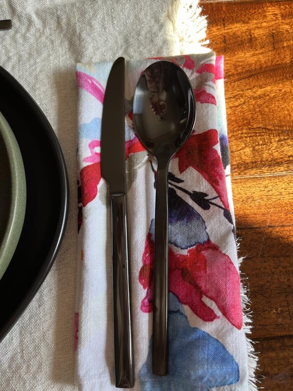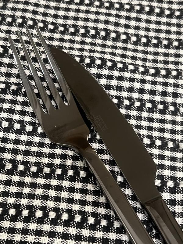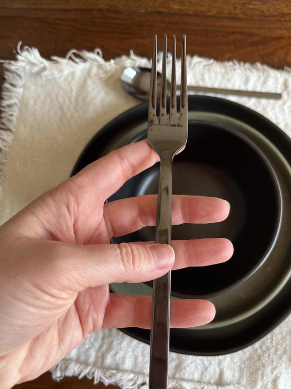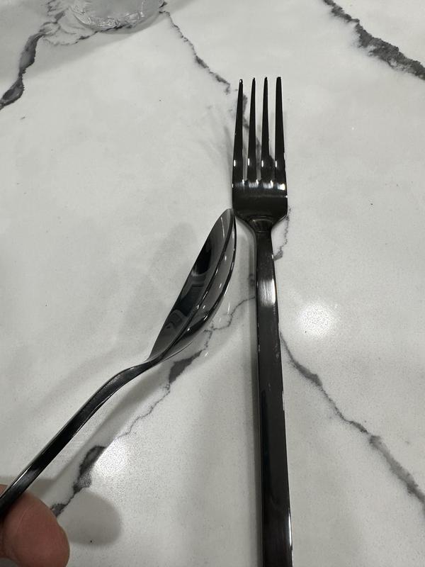 Nice cutlery set in an on trend color. The silverware handles are medium weight and shaped to fit nicely in your hand. Knife has a slightly more rounded base. Performs basic silverware function as expected. Hand washing is recommended but after a round in the dishwasher there was no discoloration, flaking or warping. If you want the spotless look, it’s easy to wipe the water spots down by hand after.