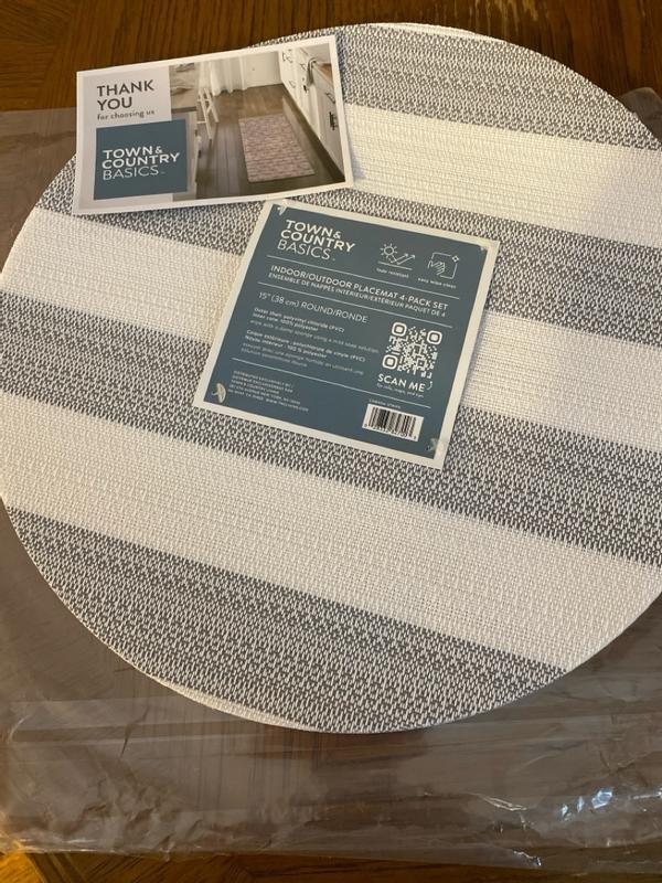 We got these lovely town and country basics Cabana Striped indoor and outdoor placemats in grey and white. We just love how simple but very elegant. They are very sturdy and nicely woven together. We love having them to keep the counter clean and they are easy to wipe down also.