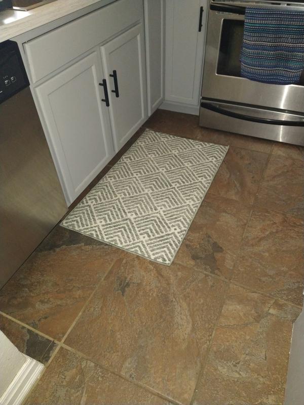 This rug is so stylish and soft. It looks great in my kitchen and is the perfect size for in front of the sink. I’ve had a few small spills on it which were easy to get up. Rug looks normal and brand new. A great addition to any kitchen.