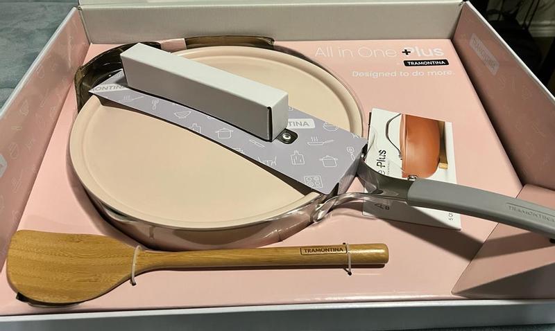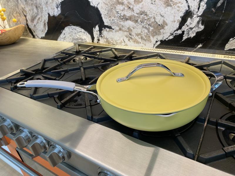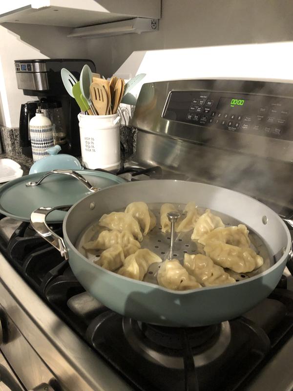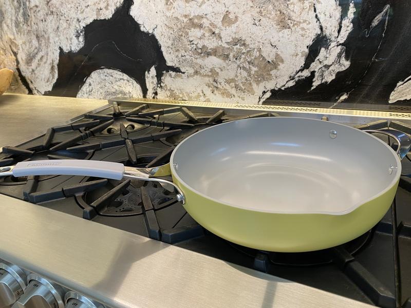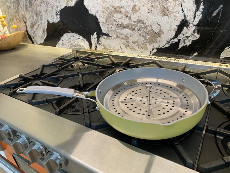 I wanted a deeper skillet to use for meals that were saucy. Prepared chicken alfredo today with this pan. There was plenty of space for food to spread out and cook evenly. Heats up quickly and cooked evenly. No cold spots noticed. The pan is not heavy but the handle on the lid gets hot. Easily gripped with a cloth to take lid off and on. The color is a beautiful matte green. Hand washed. Cleanup was a breeze. Looking forward to using the steamer insert but haven't tried it yet. Very happy with this purchase and the other Tramontina pots I have recently received.