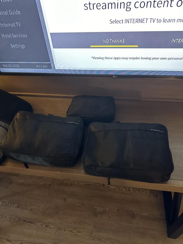 these fit perfectly in my suitcase and the quality is fantastic. I have used them on all my work trips and it keeps everything together. Love the expansion zipper too. A must for frequent travelers.