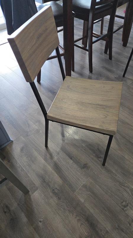 The cut of the wood and stain are a great mix of shape and texture and have a modern but warm look. Unfortunately the design of the chair focused a bit too much on creating a contrast between thin frame and thick body, and the chairs are not very sturdy. In particular, they are pretty flexible in side to side movement. Flexible enough that I wouldn't stand on these to fix a light bulb.