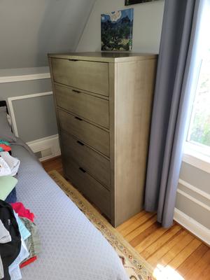Beautiful dresser. solid drawers on tight track. Top drawers lined and glide very smoothly. I love this dresser. Looks expensive.