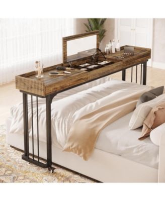 Overbed Table with Wheels, Mobile Computer Desk Makeup Vanity Desk with Storage, Standing Laptop Cart, Over Bed Makeup Table with Mirror, Vanity Desk for Bedroom, Rustic Brown