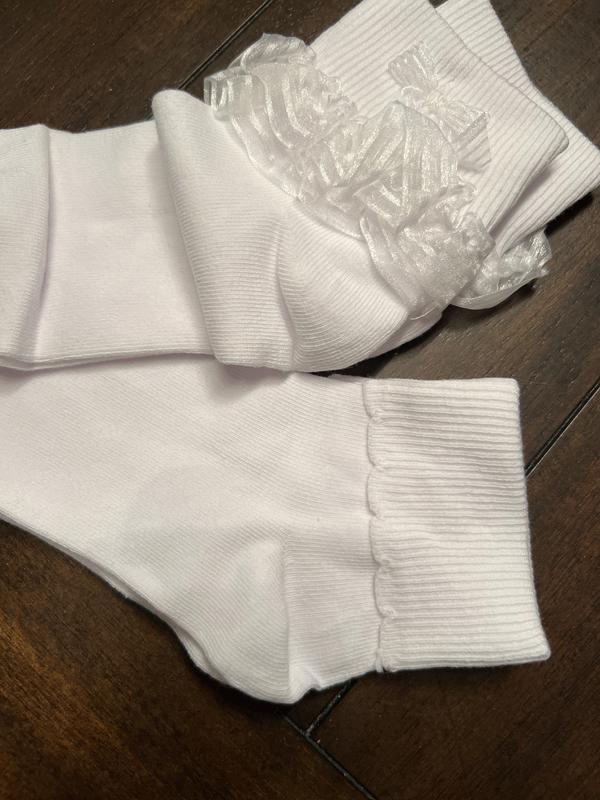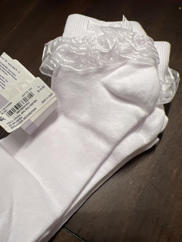 These seem to run small. I purchased based off of the size of shoe and what the sock size said. I purchased size M and two size L. My daughter wears a size 1/ 1.5. Size M was almost too small (not a lot of stretch) and hard to cuff the bottom where the lace is. For my older daughter and niece they wore size L. My neice has a chubbier foot size 2.5/3 (shoes) the size L was hard to get on her foot. However my daughter in size L has a slim narrow foot. She wears a kids size 4.5 to a size 5 in shoe. These still fit her, but again not a lot of pull and harder to cuff. I specifically wanted ruff lace. That is the reason I bought these. They worked for Santa picture and were fine for the Black Friday price.