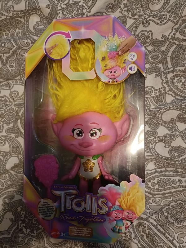 I was super excited to get the rainbow hair tunes viva troll for my grandson. She comes with a removable cape and a brush and was nicely packaged. Once opened you simply pull out the plastic strip which then allows her to work. The troll sings and says phrases which my grandson loved. I found that I had to physically push the head to get it to work brushing her hair alone did not work and there was some fallout of hair along with this We loved the film and would definitely recommend the film along with the trolls and will definitely be collecting the others within this range. Timeless fun for all the family.