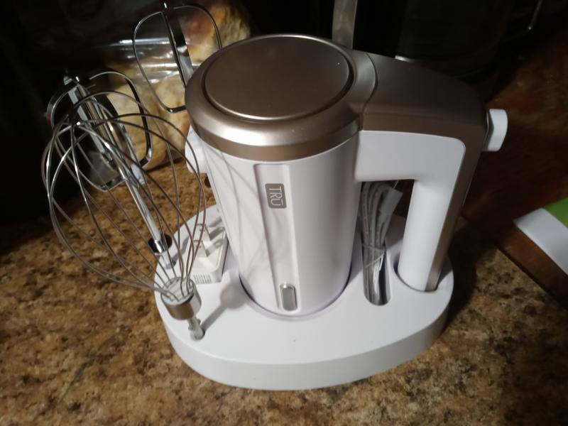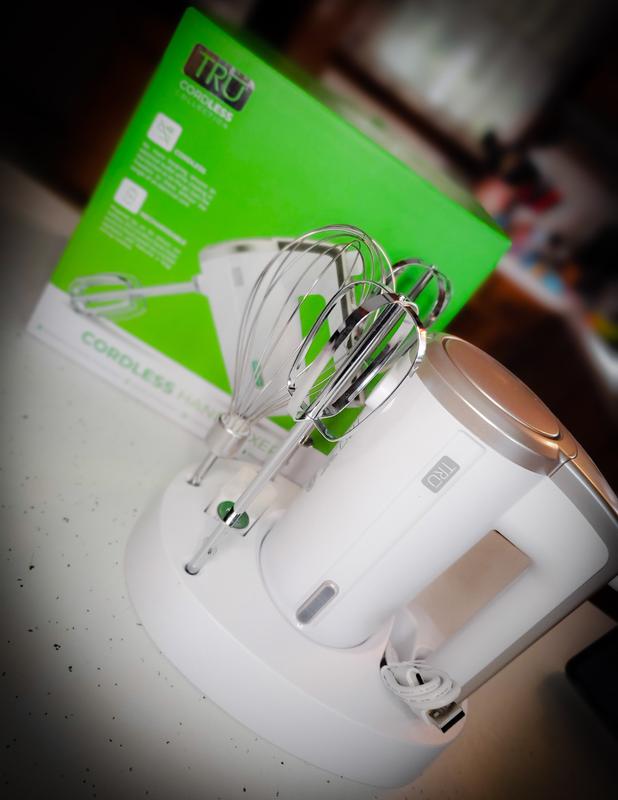 This cordless hand mixer by TRU is a great product to have. I like that this is not corded, so I am not limited to a limited amount of space. I can choose between using the beaters or a whisk, which is made of durable, long lasting stainless steel. It is great that it has a charginging base which can be used to store the items as well.