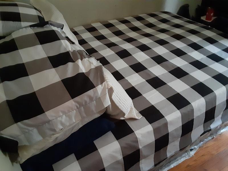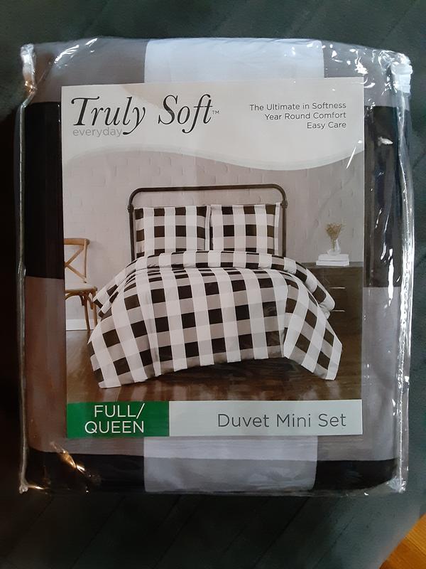 I received this black and white plaid comforter set from Truly Soft Everyday buffalo for free to try and I love it. Quuen size was perfect and its the perfect thickness. Held up in the wash too didn't frey anywhere!