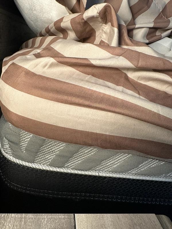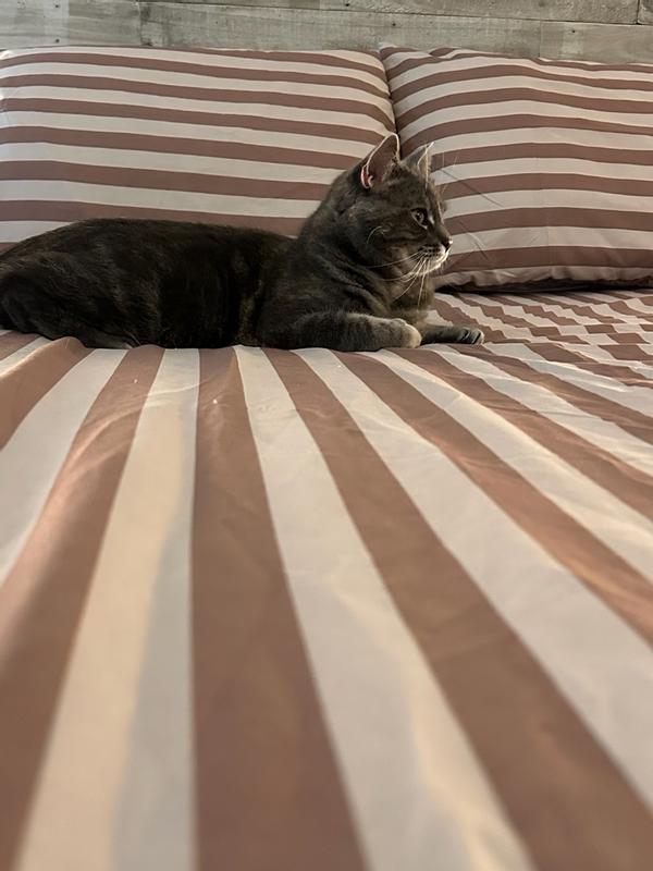 I really love the design of the sheet set — the stripe pattern is modern and stylish, and the sheets are incredibly soft right out of the package. They have a smooth, lightweight feel that’s comfortable and breathable through the night. After several washes, they’ve held up nicely with no fading or pilling, and they still feel just as soft as day one. Unfortunately, the fit is where these fall short for me. The fitted sheet doesn’t stay securely on the mattress and tends to ride up overnight (see photo). I’ve tried refitting and adjusting the corners, but by morning it’s often slipped loose again. It’s a shame, because otherwise the quality and comfort are great. On the plus side, my cat is a huge fan — she immediately claimed them as her new favorite nap spot, so they definitely pass the softness test in this house. 🐾 If the elastic or pocket depth were improved, these would easily be a five-star set. For now, they’re beautiful and cozy, but not quite as practical as I’d hoped.