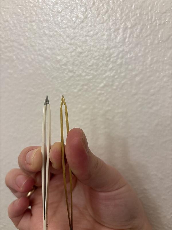 Tweezer ends don’t even line up properly. Only misaligned tip comes together with a squeeze unlike my other pair. A very poor showing from a supposedly pro (and expensive!) product. Got a pair of Swiss tweezers (see white ones) that actually work!!