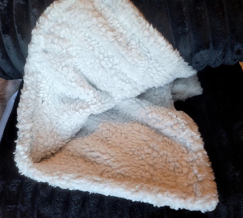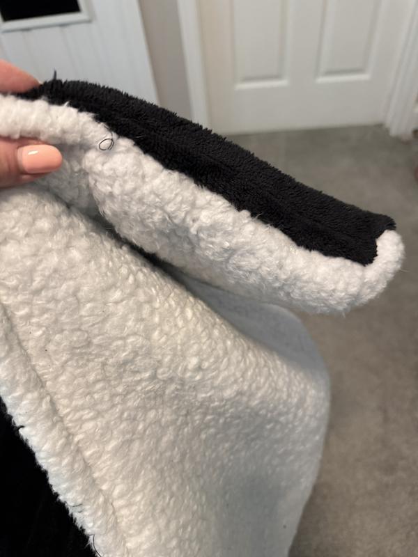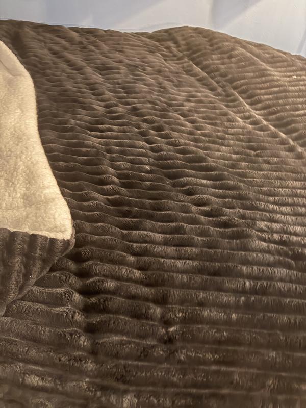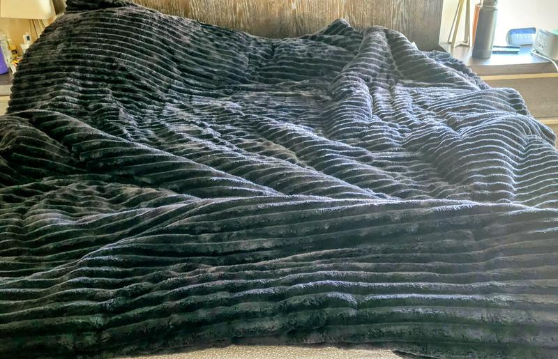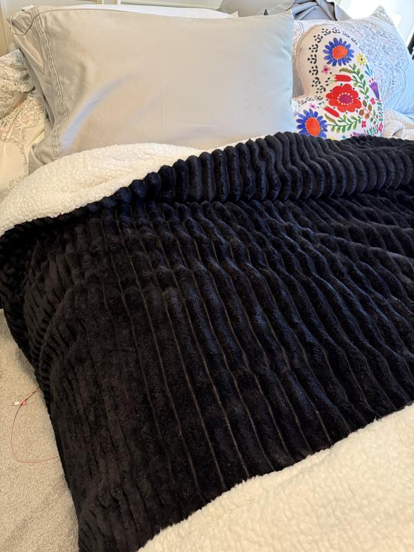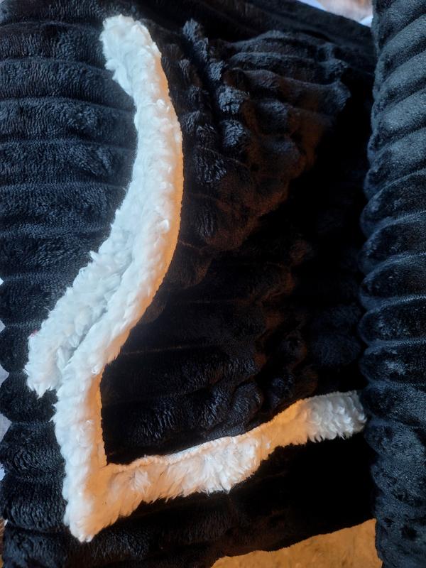 This comforter is so soft and comfortable with fluffy ribbing on one side and sherpa material on the other. The ink color is very deep black with contrasting white sherpa. I've had throw blankets like this before, but never a comforter and I expect it to be very warm. The material is great as it comes so I just hope it can stand up to washing.