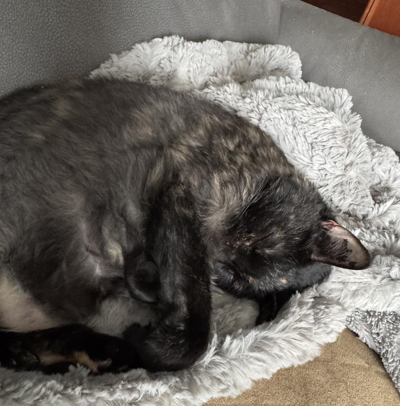 Prinnie has claimed the blanket for herself. She takes quick snack & bathroom breaks then returns to the nest she has created. If she is feeling generous, she allows another cat to join her. It’s PURRfect!