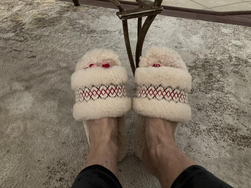 Love the look of this slipper. The sizing seems a bit off. Size 8 was way too big/long (usually wear 7 1/2 or 8) Size 7 was good in the length but the band on top was too far forward which felt awkward. Bummer since they are so cute.