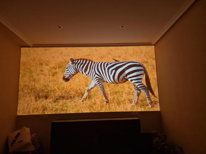 Solid Projector and Screen Combo The projector is well-built, with good material quality and solid performance. The autofocus works correctly, and the corner adjustment feature is extremely helpful for getting the image just right. Brightness is good, and contrast is decent for this price range. Android TV runs smoothly, and the projector supports 4K at 60Hz with HDR via HDMI. However, on Android TV itself, 4K is supported but without HDR. The projection screen also impressed me. It noticeably improves both brightness and contrast, especially in well-lit environments. The image appears clearer than when projected directly onto a wall. The only downside is that the top bar on the 120-inch version is slightly curved in the middle and doesn't hang perfectly straight. Overall, the price-to-performance ratio is very good. Still waiting for the soundbar, as there was a stock issue — will update once it arrives.