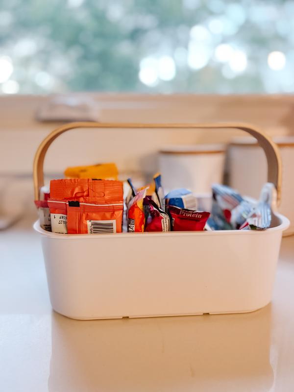 This holds all of our essentials easily and with style. I like the interior organizer to help section off smaller items. And the rounded sides are helpful when storing bottles and folded washcloths.
