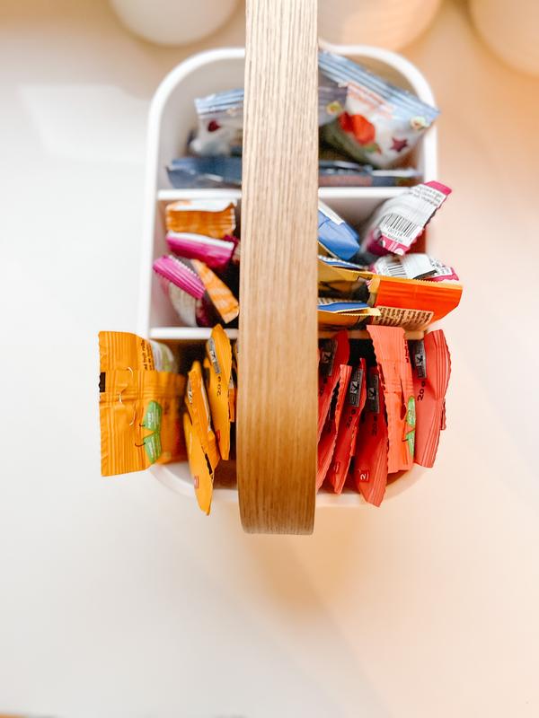 Super simple but somehow elegant storage caddy! I admit, it was on sale so I bought it without really determining where I would use it but now that I have it, I am going to use it in our guest room to corral all the little things I want guests to have including charging cords, note paper and pen, water etc. I bought the black one with the walnut handle and it looks great!