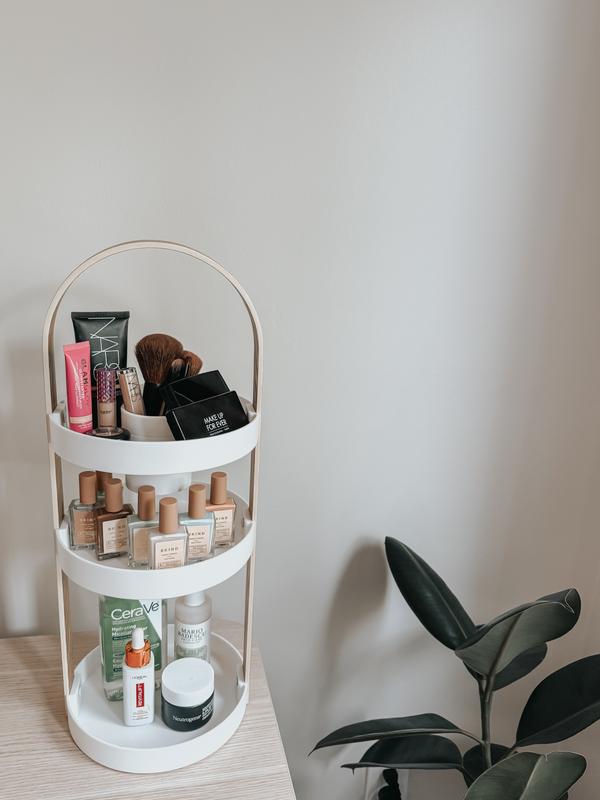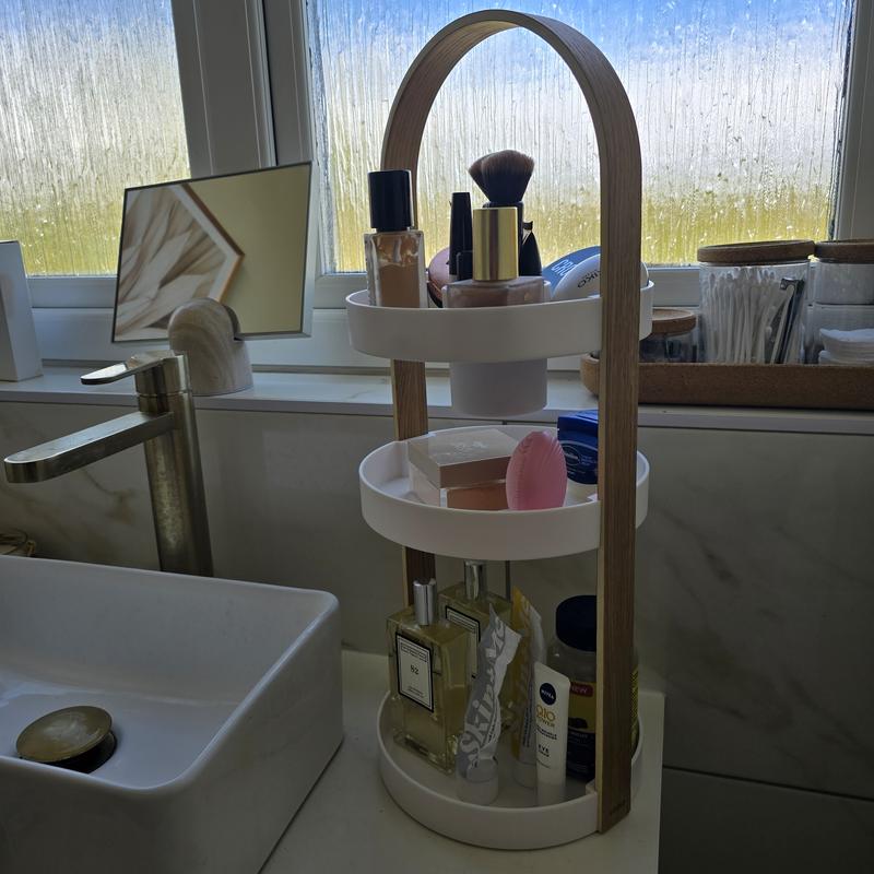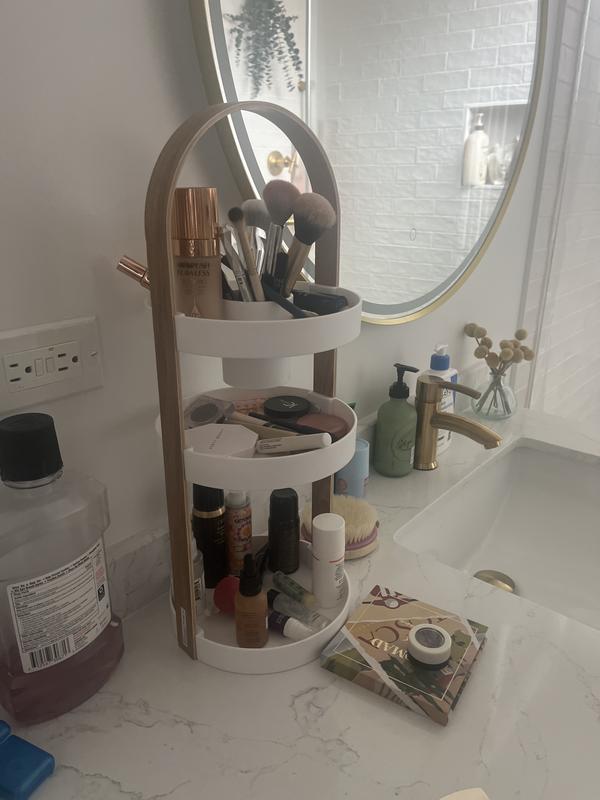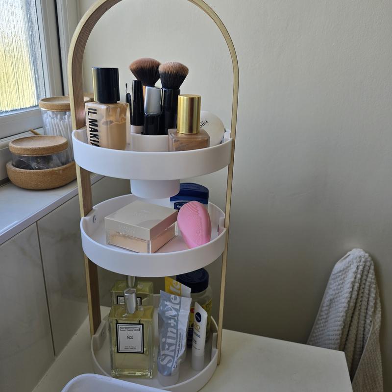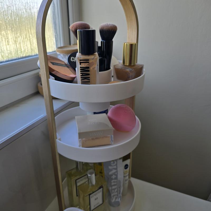 Like the cosmetic organizer. Easy to put together. Wish the height between bottom layer and middle shelf was taller.