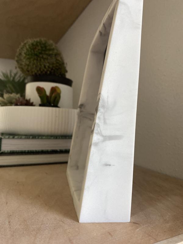 I bought this frame in white marble and it's stunning. I love the angles and the material is heavy and sturdy, exactly what I wanted for a personalized decoration element! It's a color that fits with everything as well!